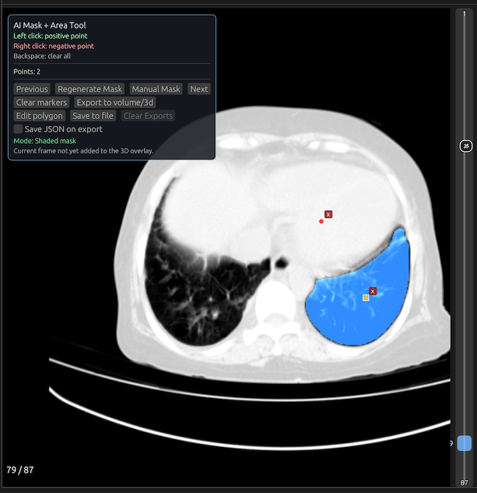 When surrounding tissue is being pulled into the mask, place negative points with right click on adjacent structures that should be excluded. This often improves separation without requiring a full redraw.